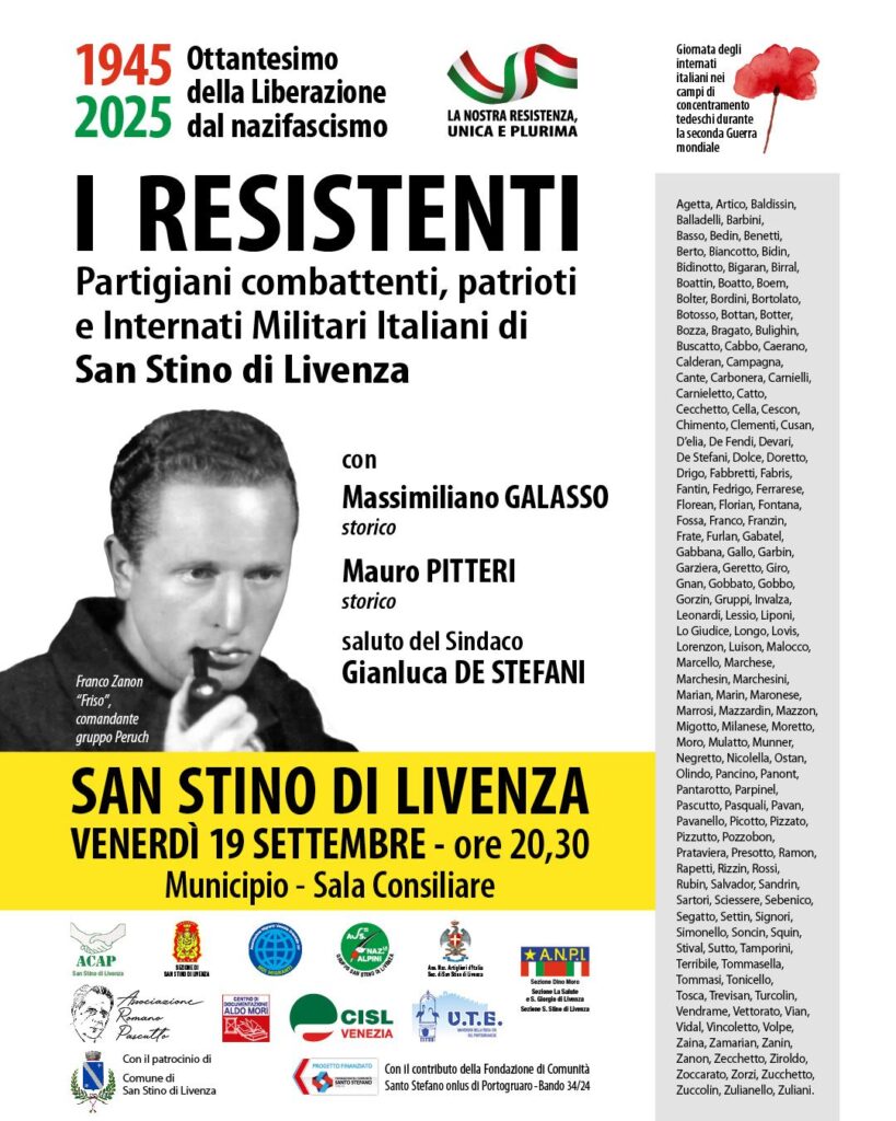 Venerdì 19 settembre, nella Sala consigliare del Municipio di San Stino di Livenza (ore 20.30) sarà presentato il volume “I Resistenti del Portogruarese” dove sono riportati i nomi di 122 partigiani combattenti e patrioti e di 119 IMI di San Stino di Livenza. L’iniziativa è parte del progetto “La nostra Resistenza, unica e plurima” che si ispira alle parole del Presidente Mattarella.