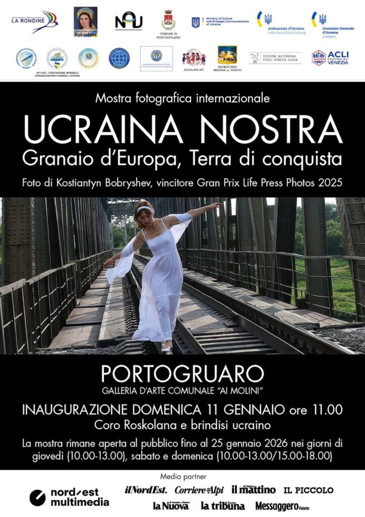 Domenica 11 gennaio 2026 (ore 11.00) si inaugura alla galleria I Molini di Portogruaro la mostra fotografica “Ucraina Nostra” con 40 foto di Kostiantyn Bobryshev, vincitore del Gran Prix Life Press Photos 2025. Un viaggio nell’Ucraina granaio d’Europa, con le sue tradizioni contadine e la bellezza dei suoi luoghi. Poi le foto di una terra martoriata dalla invasione russa. Accanto alle foto di Bobryshev, una esposizioni di pitture opere di diversi artisti ucraini.